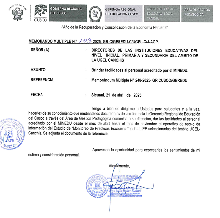 Me dirijo a su autoridad para comunicarle que en mérito a los documentos de la referencia el equipo de innovación pedagógica de la Unidad de Gestión Educativa Local Canchis organiza la Asistencia T......