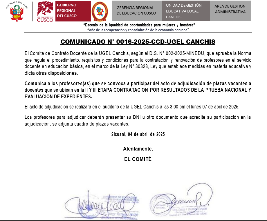COMUNICADO N° 0049-2025-CCD-UGEL CANCHIS - Contrato Docente de la UGEL Canchis...